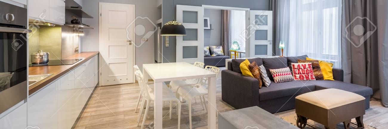 Modernes Apartment Mit Esstisch Offener Kuche Und Wohnzimmer